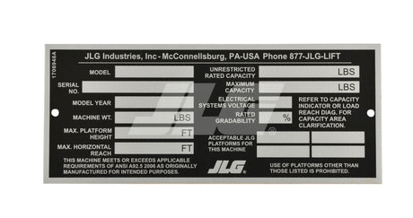 2901706 Nameplate, Cap (600#) (D/C/B/L/J | JLG